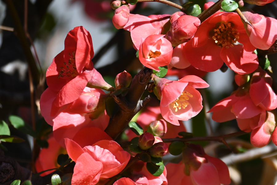 公園の反対側の花壇には一株のボケが植えられていて、深紅の花を咲かせている。