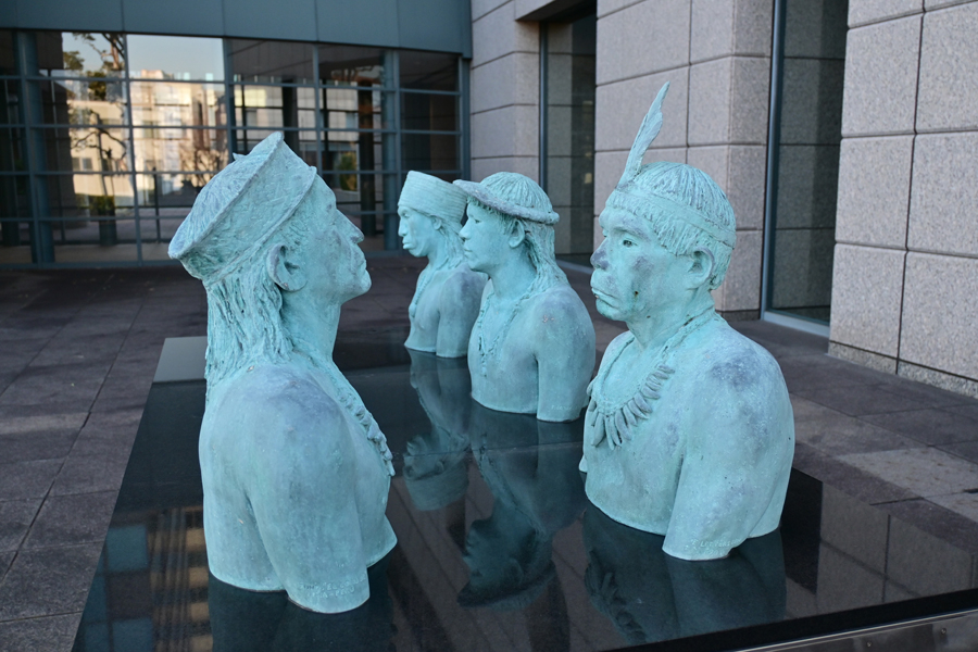 客船ターミナルの屋上部分を通り過ごして、スケートリンクとその観客席のような形をしている屋上広場の野外劇場にでた。ここにプロジェrクションマッピングが投影される。キング(県庁)、ジャック(横浜市開港記念会館)、クイーン(横浜税関)の方角が示されている。屋上広場の先には、最大1,100人を収容できる約2,000㎡の大さん橋ホールがある。大さん橋ホール入口を通り過ぎて、その屋上に行ってみた。ここはプロジェクションマッピングの撮影ポイントと紹介されていて、既に大勢の人が陣取っていた。ここからスケートリンクのような広場に投影されるプロジェクションマッピングを撮ることは困難だった。