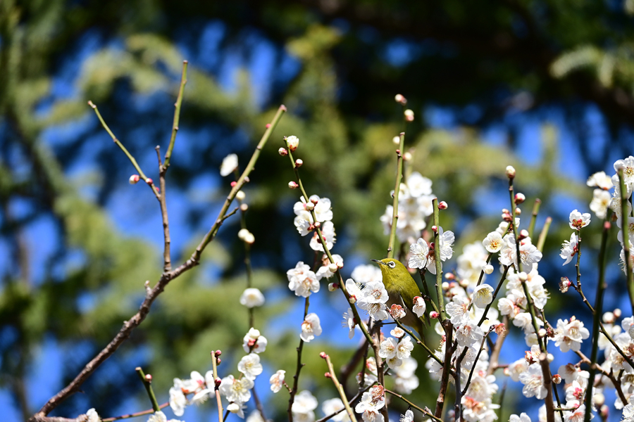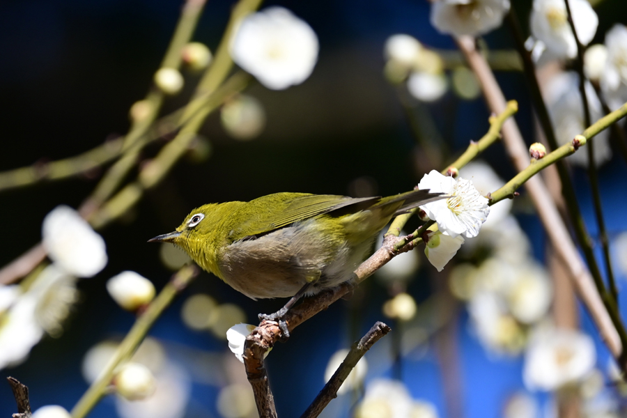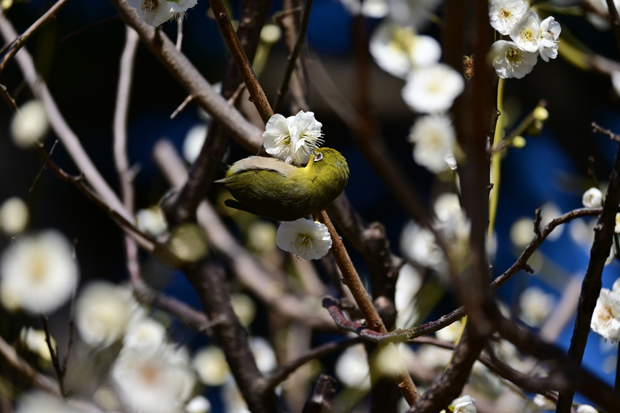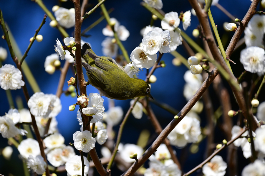 目白は花から次の花へと素早く移動し吸蜜する。この梅は「思いもまま」のようだ。メジロはいろいろな花の蜜を好む。桜、梅のほかツバキ、サザンカ、ビワにも来る。花の蜜を吸うために嘴が細長い。