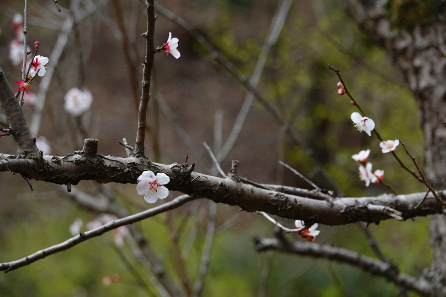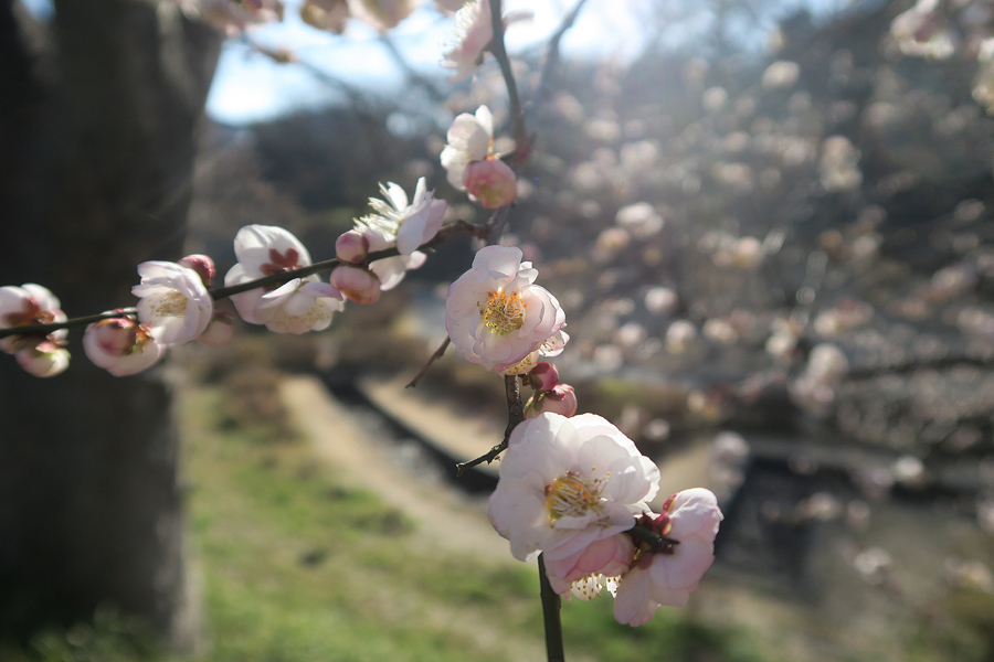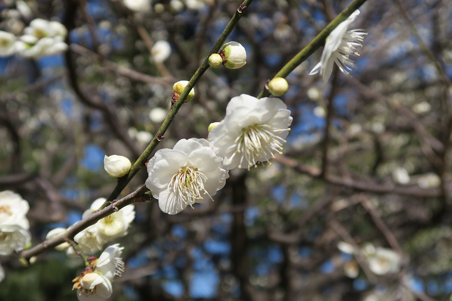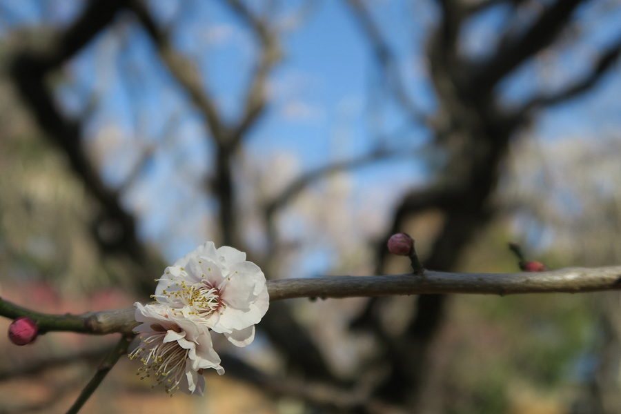 3週間前に来た時には咲いていなかった「思いのまま」が咲き始めていた。同じ樹に咲く紅色の花と白い花を等距離に置いてシャッターを切る。1本の木から白、桃、赤、絞り(紅白混ざり)の花を咲き分ける、野梅系の非常に美しい花梅(観賞用)だ。