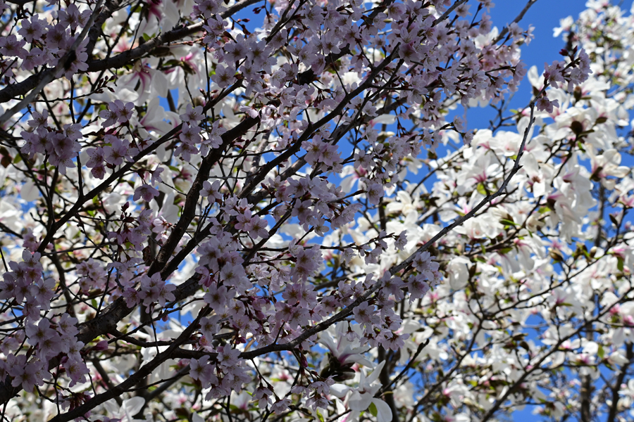 手前に桜の花が咲いている。その向こうに重なってこぶしの白い花が咲いていた。桜は日陰になってしまい、コントラストが出ない。