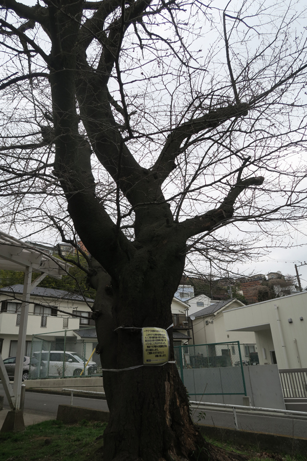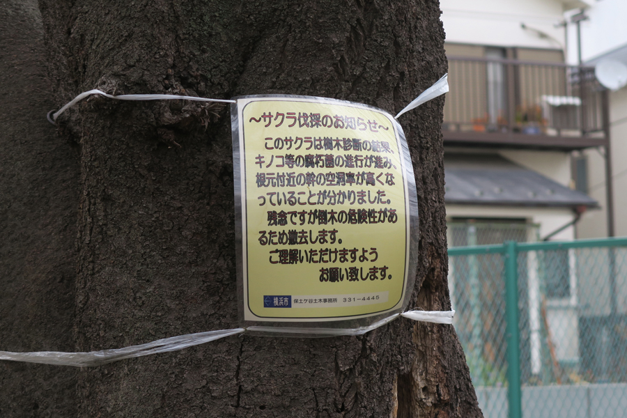 この小さな公園の片隅にソメイヨシノの古木がある。この古木の幹に張り紙がされていて、キノコなどの腐朽菌の進行が進み、根本付近の空洞率が高くなっているいるので、残念ながら倒木の危険性があるため撤去するという。撤去される時期について、横浜市の保土ヶ谷土木事務所に電話で聞いたところ、この春のお花見が終わってからになるが、まだ撤去作業の業者さんも決まっておらず、日程は決まっていないとの答えだった。ソメイヨシノの寿命は一般的に60年〜80年と言われ、50年を過ぎると幹の内部が腐りやすくなり、老齢化(樹勢の衰え)が進むそうだ。
