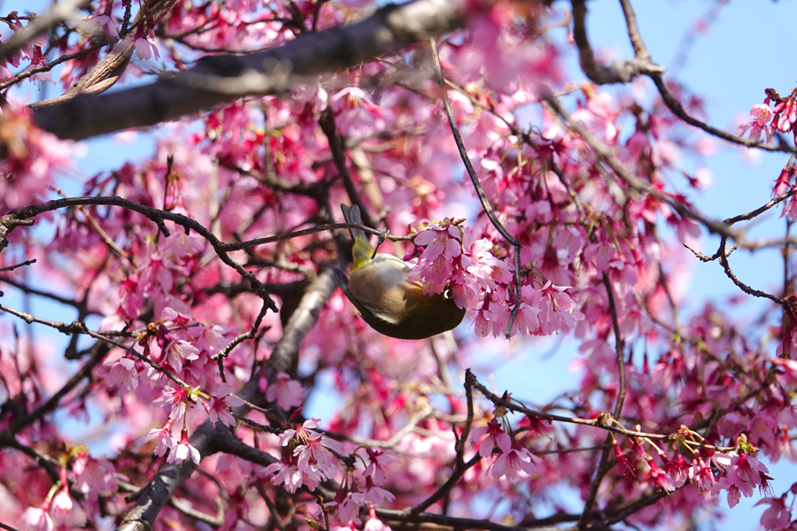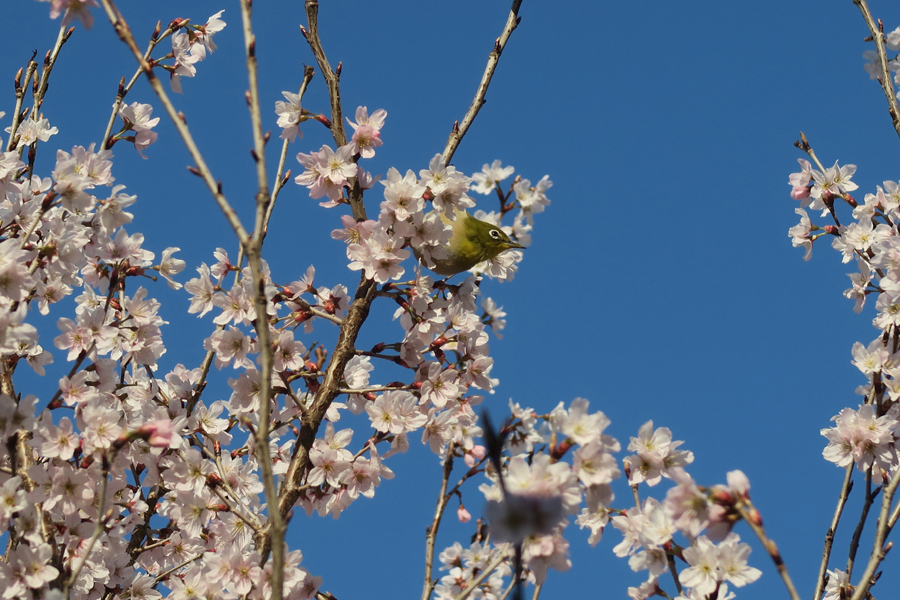 再び反対側のコブシの隣に咲く修善寺寒桜を見に行った。また枝の先端に咲く日の当たる花にメジロが来ていた。