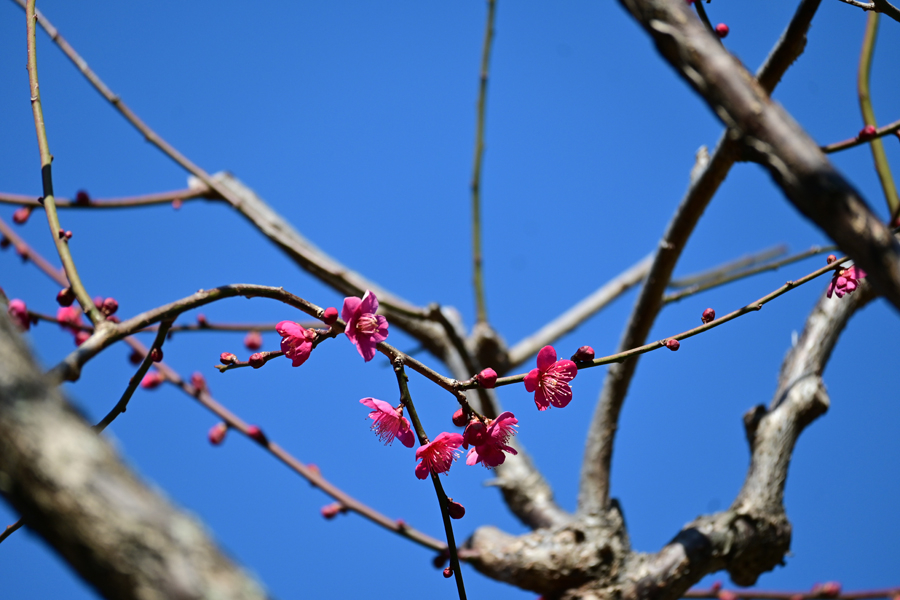 枝垂れ梅が咲いていた。艶のある明るい紅色の花を咲かせる緋梅系(紅梅性)の美しい一重咲き枝垂れ梅といわれる。2cm〜2.5cm程度の中輪で、比較的遅咲きとされるが咲き始めていた。枝垂れ梅をそれらしく撮るのは難しい。