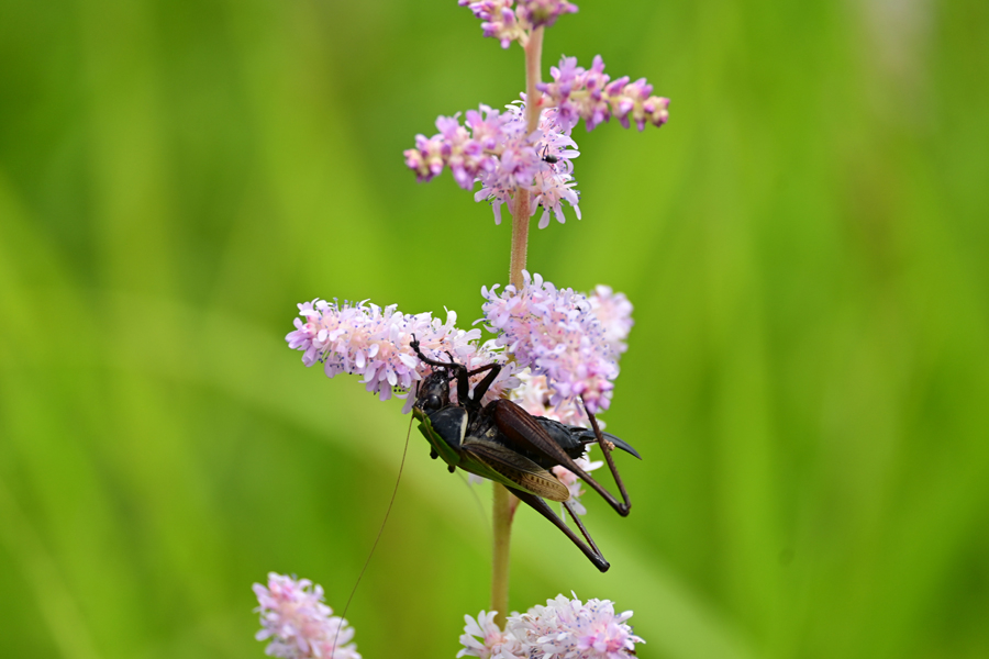 チダケサシの花にバッタ目キリギリス科のヒメギスが飛んできた。wikipediによれば、「キリギリスに姿形が似ていて小型なことからこの和名が付いた。普通種で、もっとも身近に見られるキリギリスの近似種でもある。草原性で、キリギリスよりやや湿り気を好み、草丈も低めの場所にいる。」と解説されていたが、まさにその通りという場所にいた。