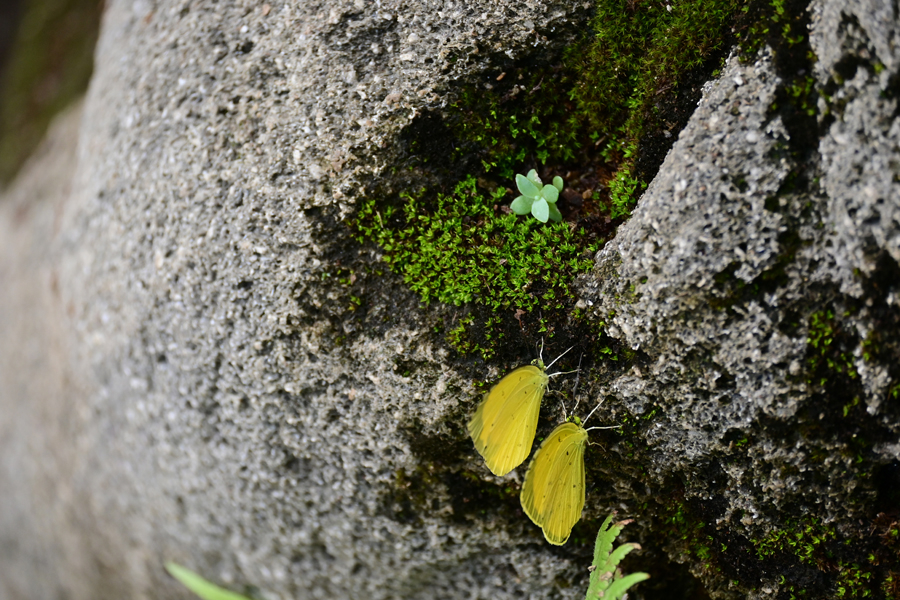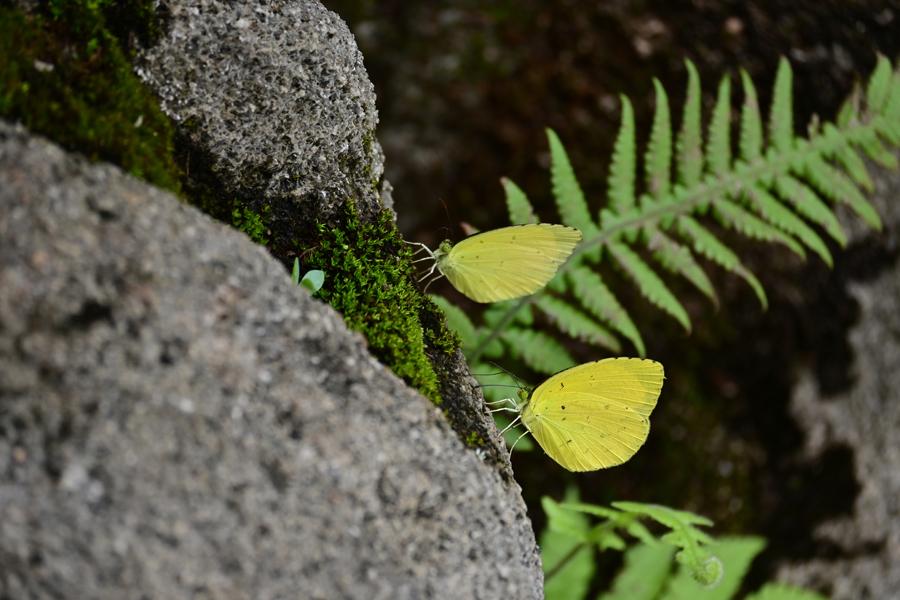 食虫植物展に設けられた岩場に、キタキチョウが2頭止まって吸水していた。ともに♂のようだ。
