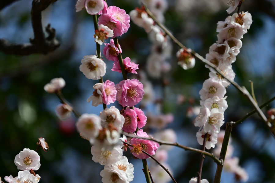紅梅と白梅が入り混じって咲いている。品種名の札がないのでよく分からないが、「思いのまま」かもしれない。
