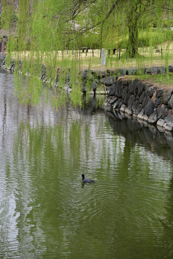 柳の新緑の枝が池に垂れるところにオオバンがいた。