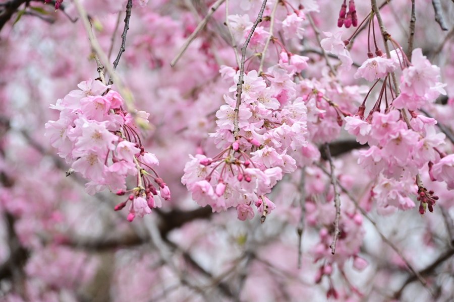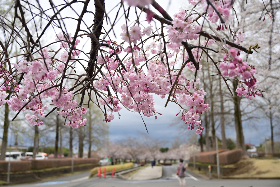 午後4時20分、そろそろバスに戻る時間が来た。公園の入り口には、枝垂桜が咲いていた。エドヒガン(江戸彼岸)だろうか?