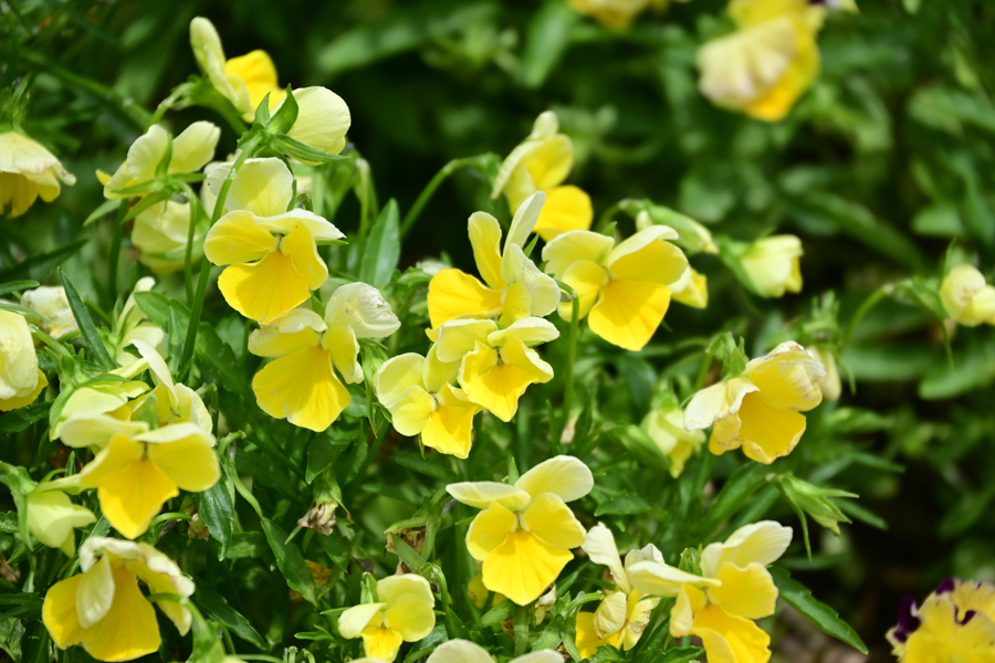 19.黄色いパンジー 下の1階部分が駐車場になっているピロティーは、区役所の入口へのアプローチになっていて、その縁は花壇があり、ボランティアの方々が花を咲かせている。パンジーは、ヨーロッパ原産の野生のスミレを改良したもので、花の色や模様が豊富で、大輪のものをパンジー、小輪のものをビオラと呼んでいたが、現在は品種改良が進み、区別が難しくなっているそうだ。