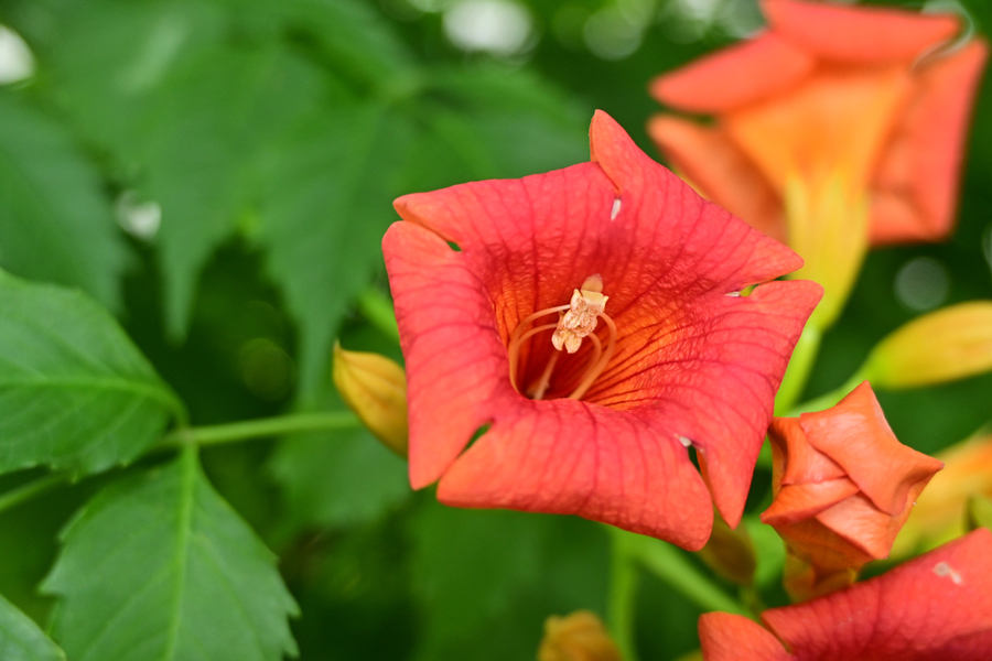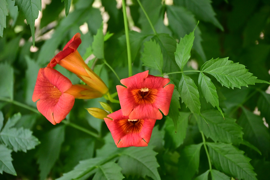1.峰岡公園に咲く花 アメリカンノウゼンカズラ (亜米利加凌霄花) -1 桜の古木の下でアメリカンノウゼンカズラが咲いていた。よく目立つ。この花は北アメリカ原産であり、花の筒部が長く、直径が小さい。また、日本には平安時代に中国から渡来したとされるノウゼンカズラがあるが、民家の庭でよく見かけられ、暑い夏に花が咲き続けるという。