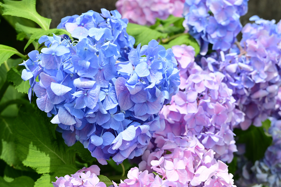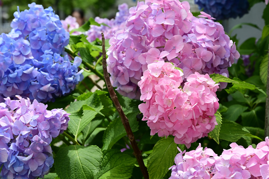 ひとつの株に咲く、濃淡のある青、紫、ピンクの紫陽花 2025年6月12日 横浜市保土ヶ谷区役所前