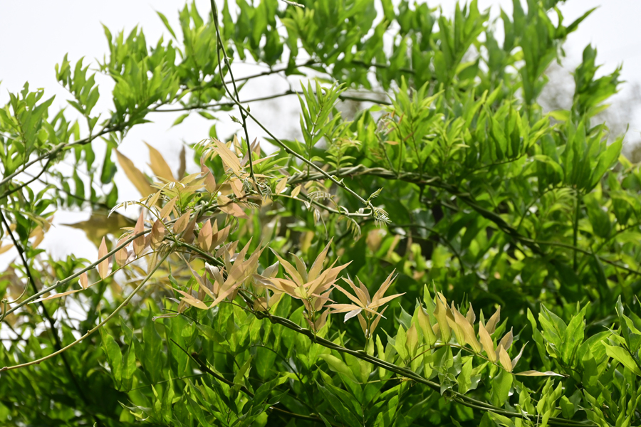 24.フジの新芽 峰岡公園のグランドから一段高いところに小さな藤棚がある。花が咲き終わって、特徴のある黄色味がかった新芽が出てきていた。
