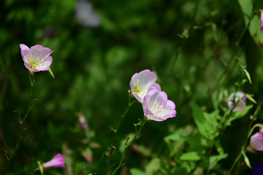 12.ヒルザキツキミソウ(昼咲月見草) 良く見るとここにはいろいろな花が咲いていた。ヒルザキツキミソウは、花序はつぼみのときは下向きにうなだれ、花は日中でも開く。花径4-5cmくらいの大きさの、白色または薄いピンク色で基部が黄色く染まった花である。