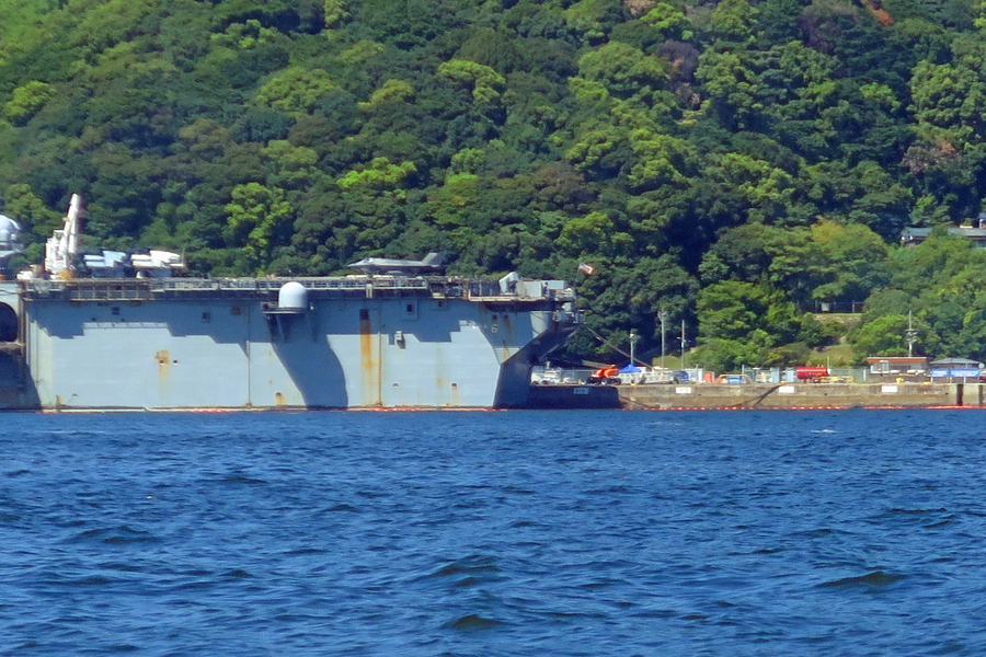 そろそろ入港の時間が近くなって来た。すぐそばの米軍の軍用艦らしき船は動いてはいないようだ。船の構造から、米海軍の補給艦のようだ。