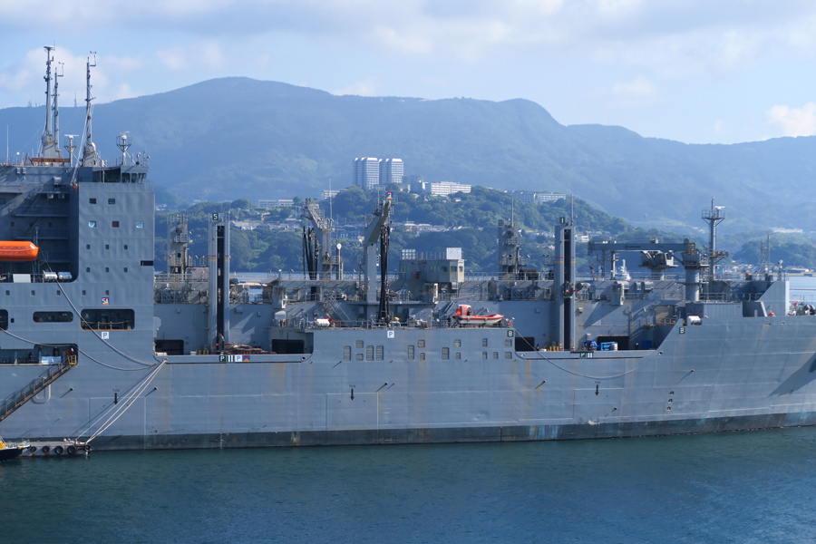 港内に停船して何か荷の積み下ろしをしているように思われる米海軍補給艦のすぐ近くを通り抜ける。