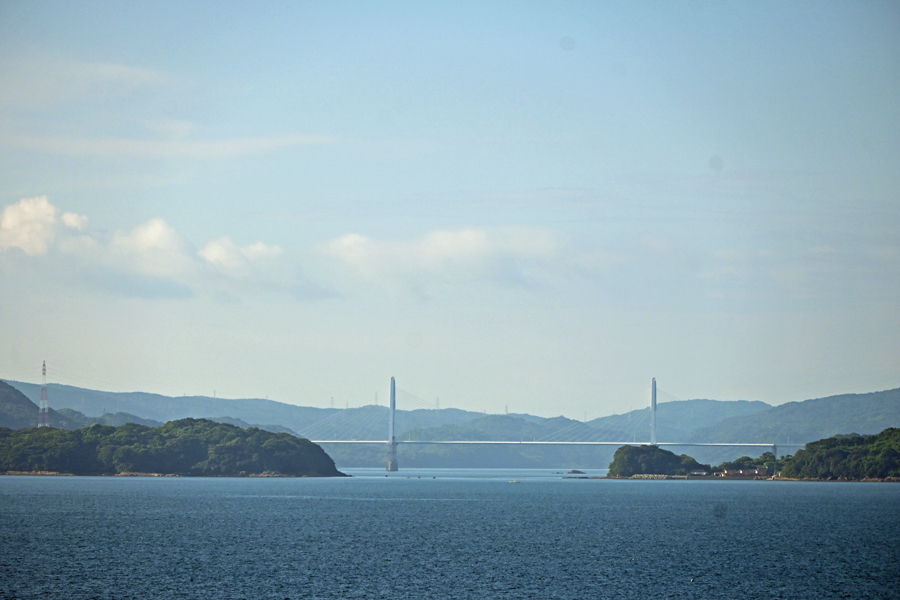 スマホで"レンズ"で検索してみたところ、長崎港の入り口にある乙女大橋だろうとの答えだった。地図で確認してみたが航路からすると違うのではないかと思った。いろいろネット検索をして、この橋は沖ノ島と伊王島を結ぶ伊王島大橋だろうと推定した。伊王島大橋は長崎市伊王島町沖ノ島と長崎市香焼町を結ぶ道路橋である。2011年3月27日に開通している。
