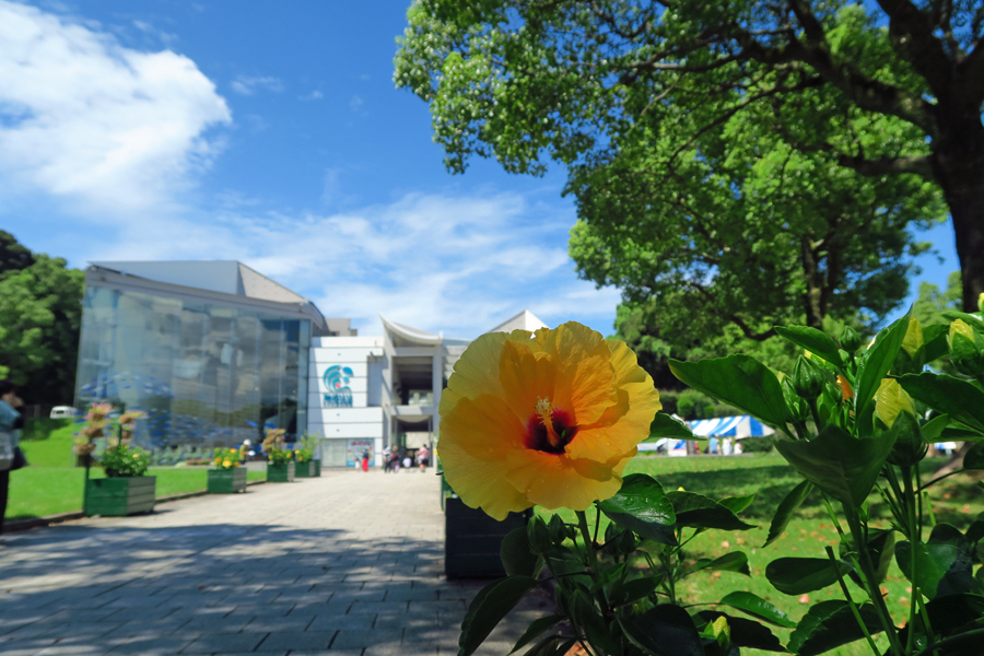 JR佐世保駅へ徒歩5~6分という佐世保港国際ターミナルからタクシーに乗って、九十九島遊覧船の乗り場のある九十九島パークリゾートに着いたのは11時頃だった。佐世保市立の水族館や遊覧船・飲食店・土産物店などの複合施設があり、公園のようになっていた。写真の黄色いハイビスカスの後ろに見えるのが2009年7月18日にリニューアルオープンした「西海国立公園 九十九島水族館 海きらら」だ。