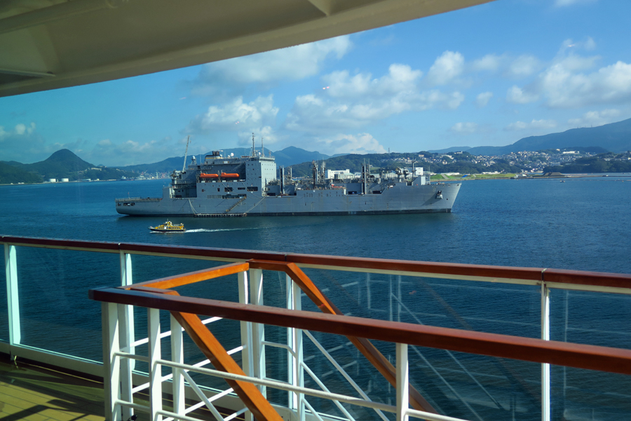 入港の予定時刻は9時30分。港に近づくと米軍の軍用艦らしき船が見えた。どんどん近づく。佐世保港は米海軍第7艦隊の重要な拠点で、MITSUI OCEAN FUJIを下船して、海上バスで佐世保市内へ向かったが、海上バス中からも大きな米海軍の艦船をみた。