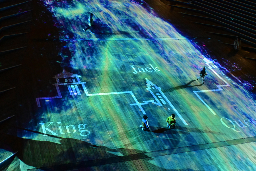 場所を移動した。大ホールの屋上から、野外劇場のスタンドのようになっているところへ移動した。屋上広場のスケートリンクのような野外劇場では、人々がプロジェクションマッピングの光を浴びて、楽しんでいた。