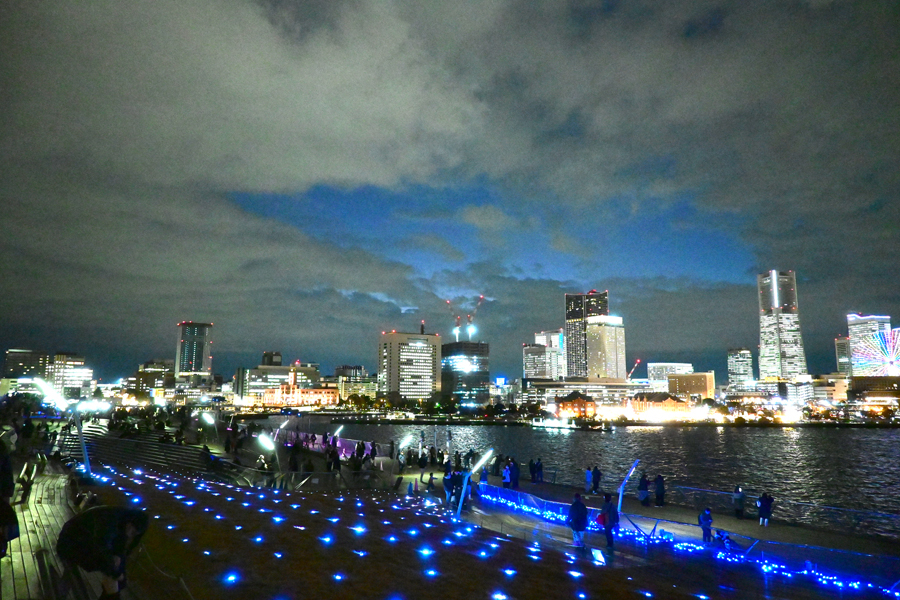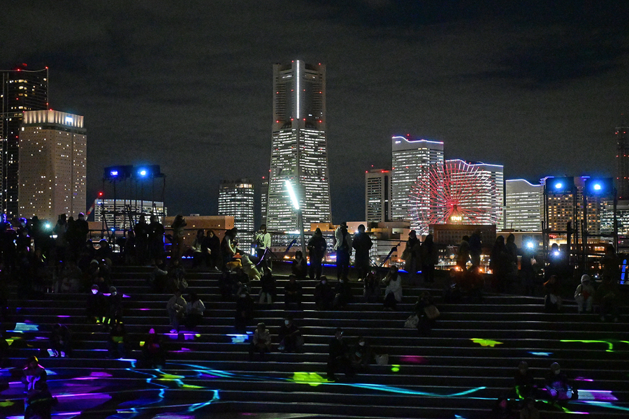 スケートリンクのような野外劇場の観覧席の向こうに、みなとみらいの灯りが輝く。
