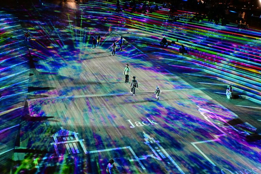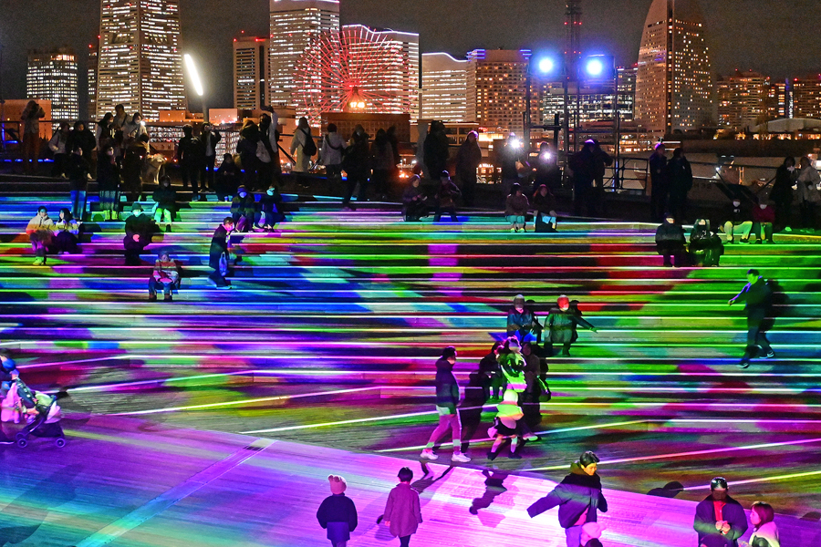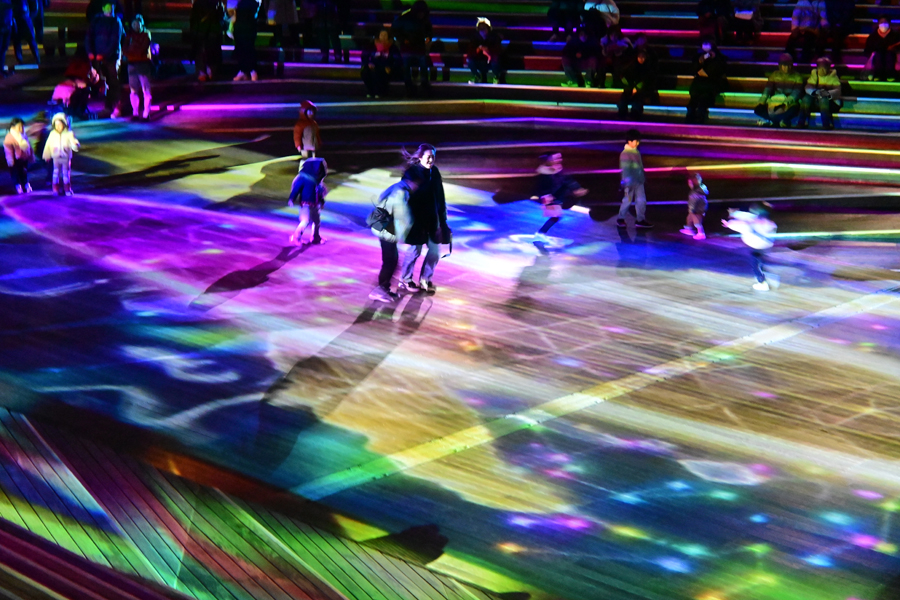 野外劇場の観覧席がプロジェクションマッピングで七色に照らし出されて、リンクで遊ぶ親子連れはまるでスケートを楽しんでいるようだ。