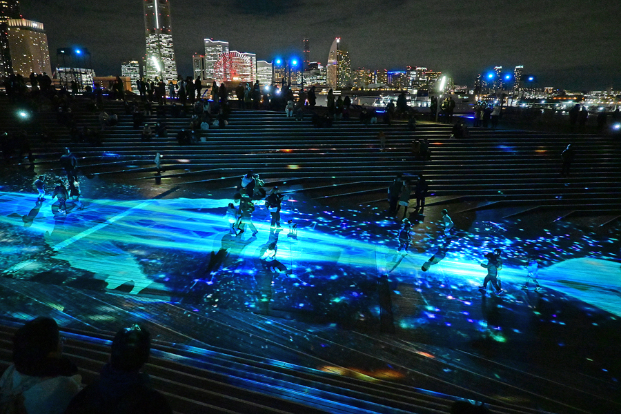 私の目的は大さん橋屋上広場のスケートリンクのような形をした「野外劇場」に泳ぐクジラのプロジェクションマッピングだった。プロジェクションマッピングのクジラは常に泳いでいるわけではない。突然泳ぎ始めては、大さん橋の入口の方へと消えていく。しばらくは、花柄模様などの投影があり、またしばらくして突然鯨が現れる。そのクジラは泳ぐのが速い。ぼやぼやしているとすぐいなくなってしまう。
