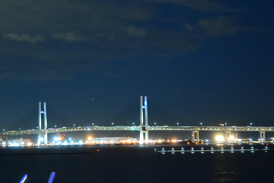 反対側をみるとライトアップされたベー・ブリーッジガ見える。8月にMITSUI OCEAN FUJIのクルーズで帰港したときのことを思い出した。