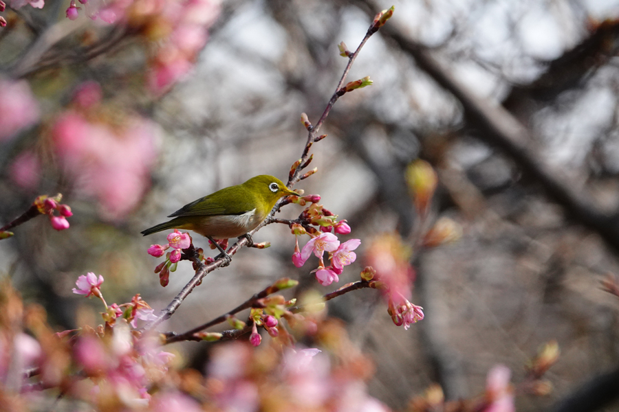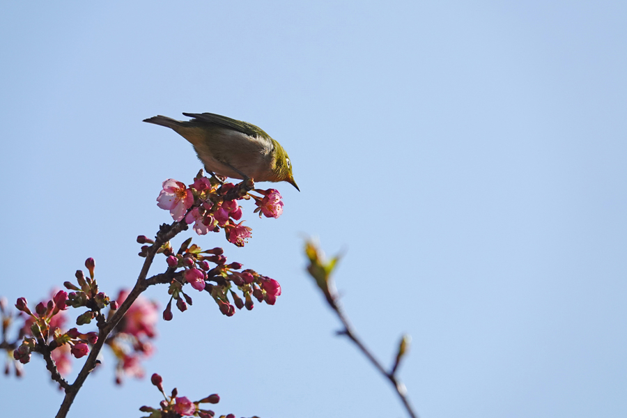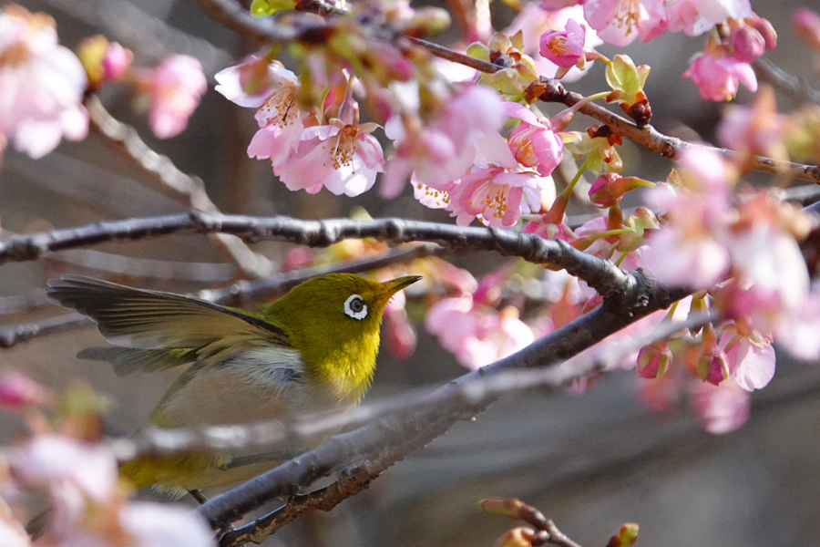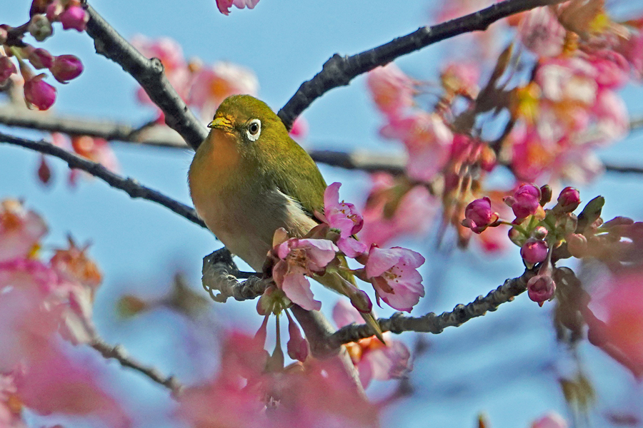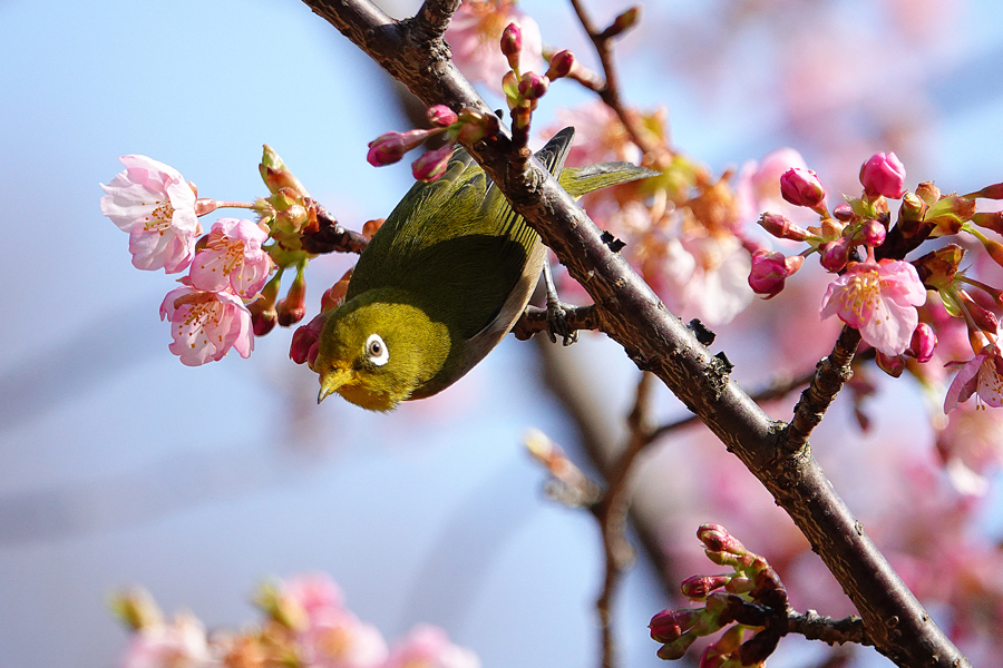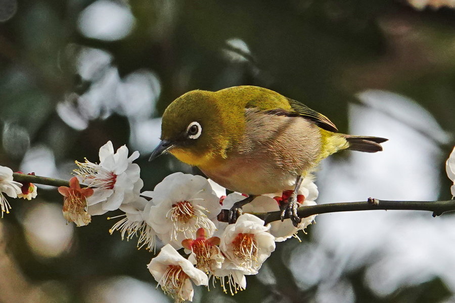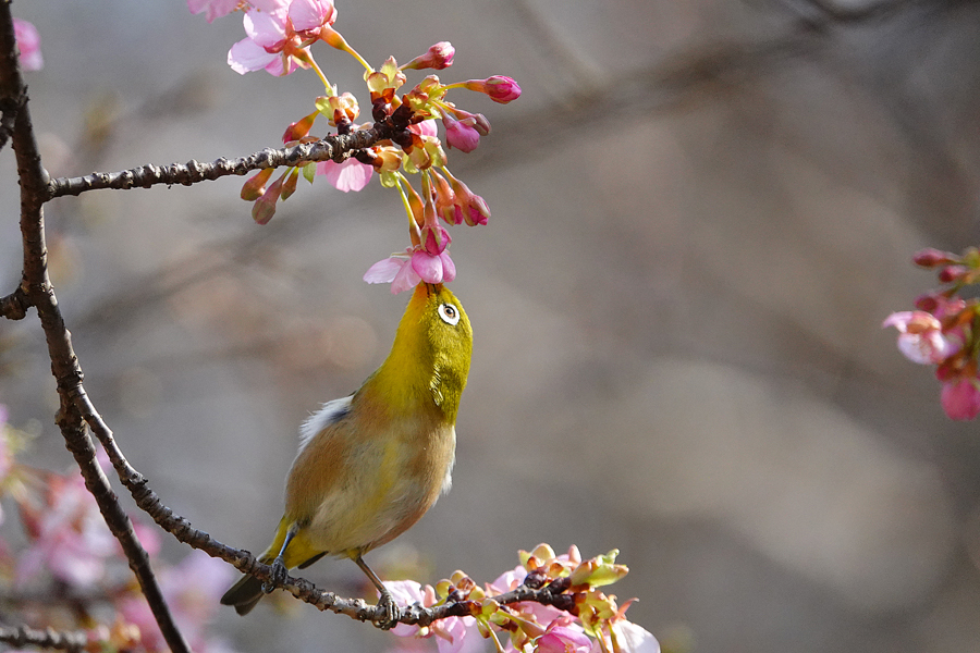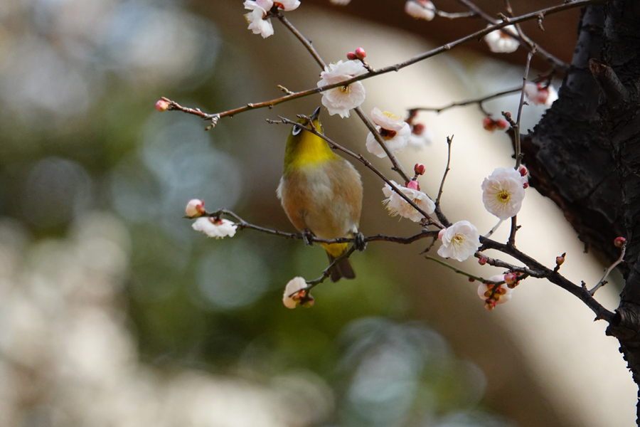 目白は花から次の花へと素早く移動し吸蜜する。この梅は「思いもまま」のようだ。メジロはいろいろな花の蜜を好む。桜、梅のほかツバキ、サザンカ、ビワにも来る。花の蜜を吸うために嘴が細長い。