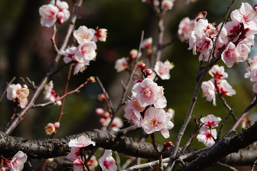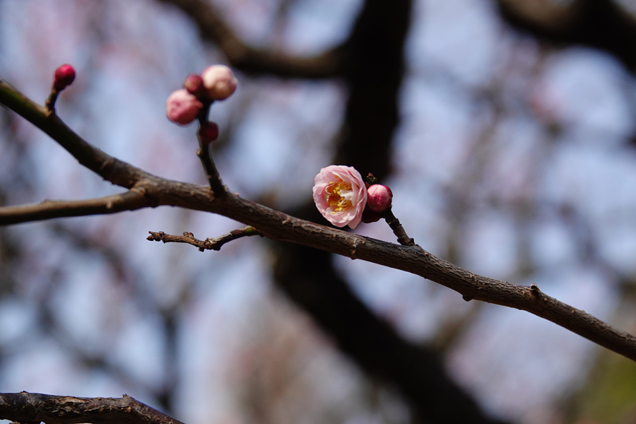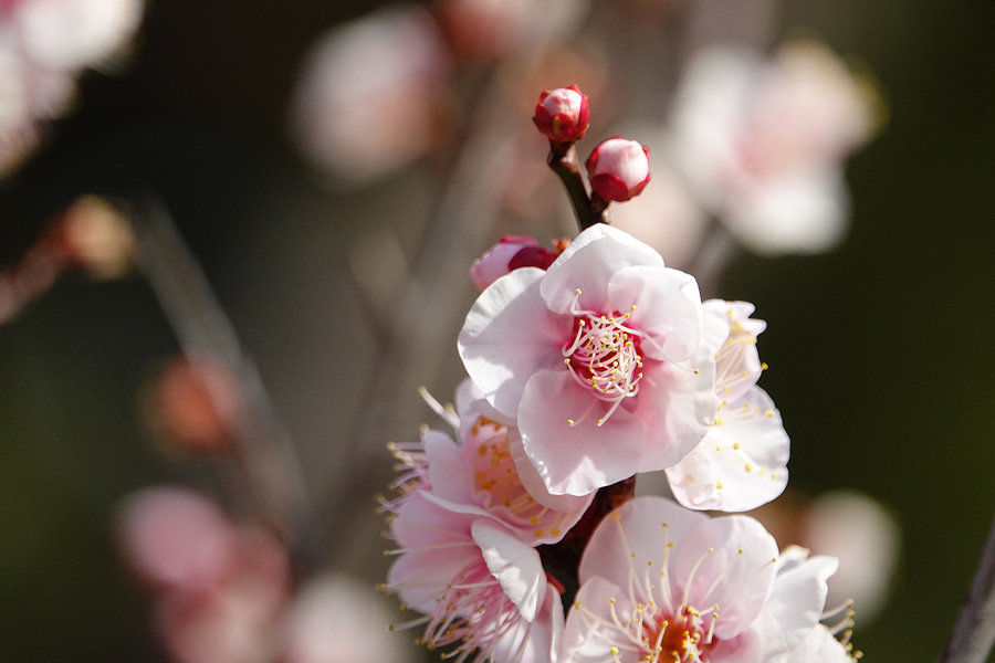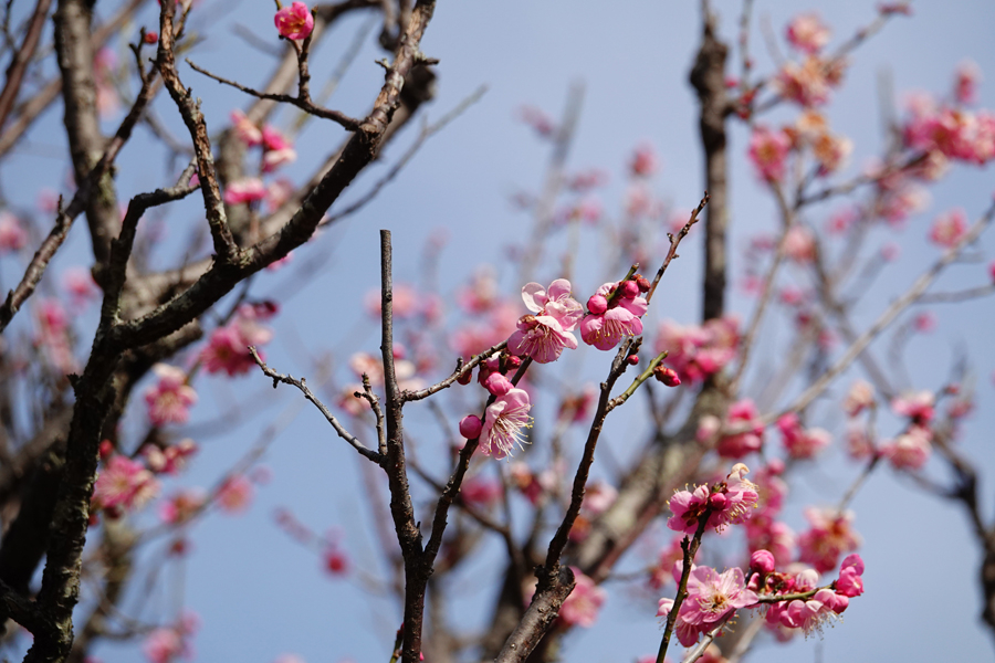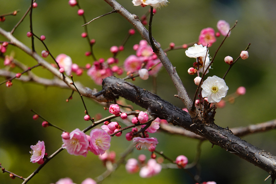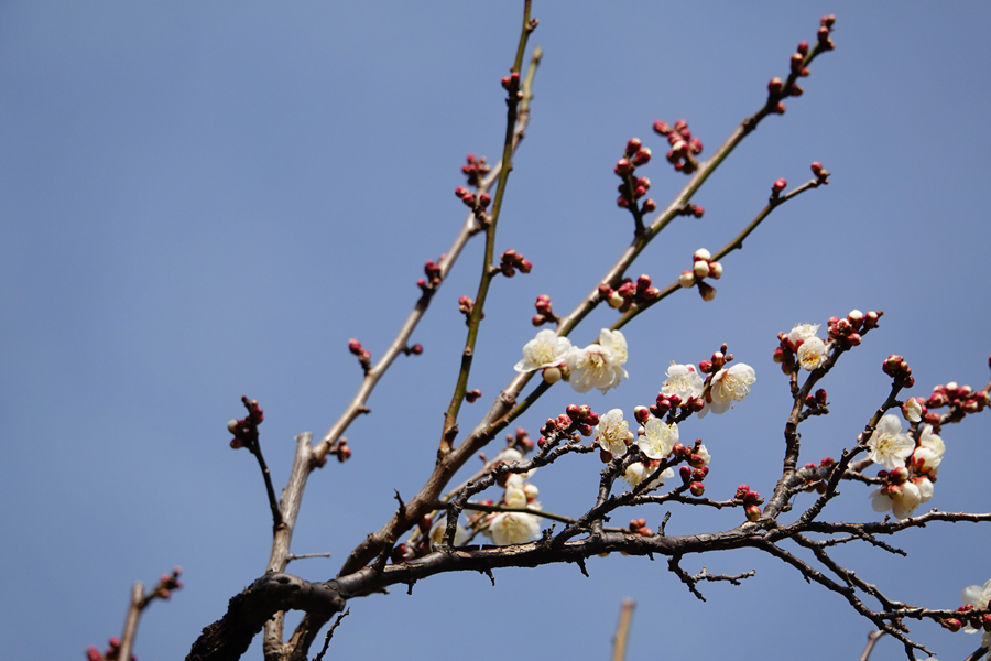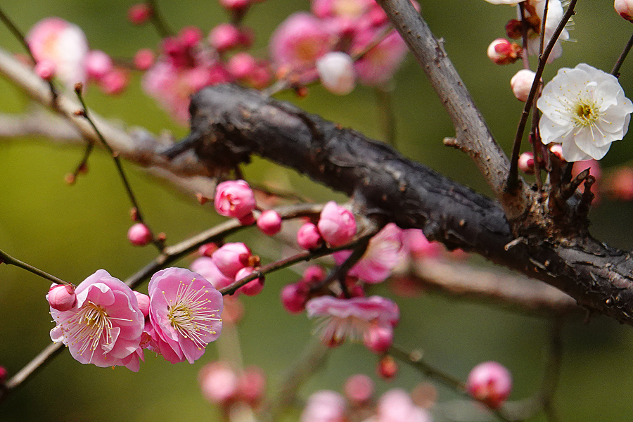 3週間前に来た時には咲いていなかった「思いのまま」が咲き始めていた。同じ樹に咲く紅色の花と白い花を等距離に置いてシャッターを切る。1本の木から白、桃、赤、絞り(紅白混ざり)の花を咲き分ける、野梅系の非常に美しい花梅(観賞用)だ。