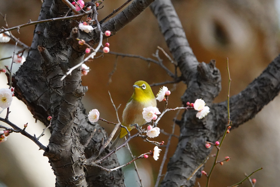 ここにいたメジロはこの1羽だけだが、近くに立つ他の梅の木に移動した。これは八重野梅のようだ。メジロは花の蜜のほかに、バナナやミカン、また小さな昆虫やクモなども食べるようだ。