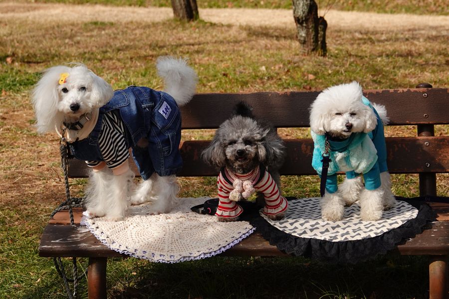 犬種を聞いておくのを忘れたので、AIに写真を送り尋ねたところ、3匹ともトイ・プードルだった。ご主人たちの言いつけを聞いて3頭のトイ・プードルはベンチに座った。「写真撮らせてください」とお願いすると、快く「どうぞどうぞ」とお許しが出た。wikipediaで調べて見るとプードルは、古くからヨーロッパで広くみられ、特にフランスでの人気が高く、「フレンチ・プードル」と呼称されることもあるという。水中回収犬、鳥獣猟犬や愛玩犬(ペット)として飼育される犬種だそうだ。プードルには、スタンダード、ミニチュア、トイがあり、トイ・プードルはミニチュア・プードルを純粋に愛玩犬として飼育するために更に小型化したものだそうだ。飼いやすさ、知能の高さで全犬種人気ランキングで不動の1位を獲得しているという。2019年1月から12月の間で登録されているプードル合計7万4240頭のうち、トイ・プードルが7万2941頭と圧倒的に多い。