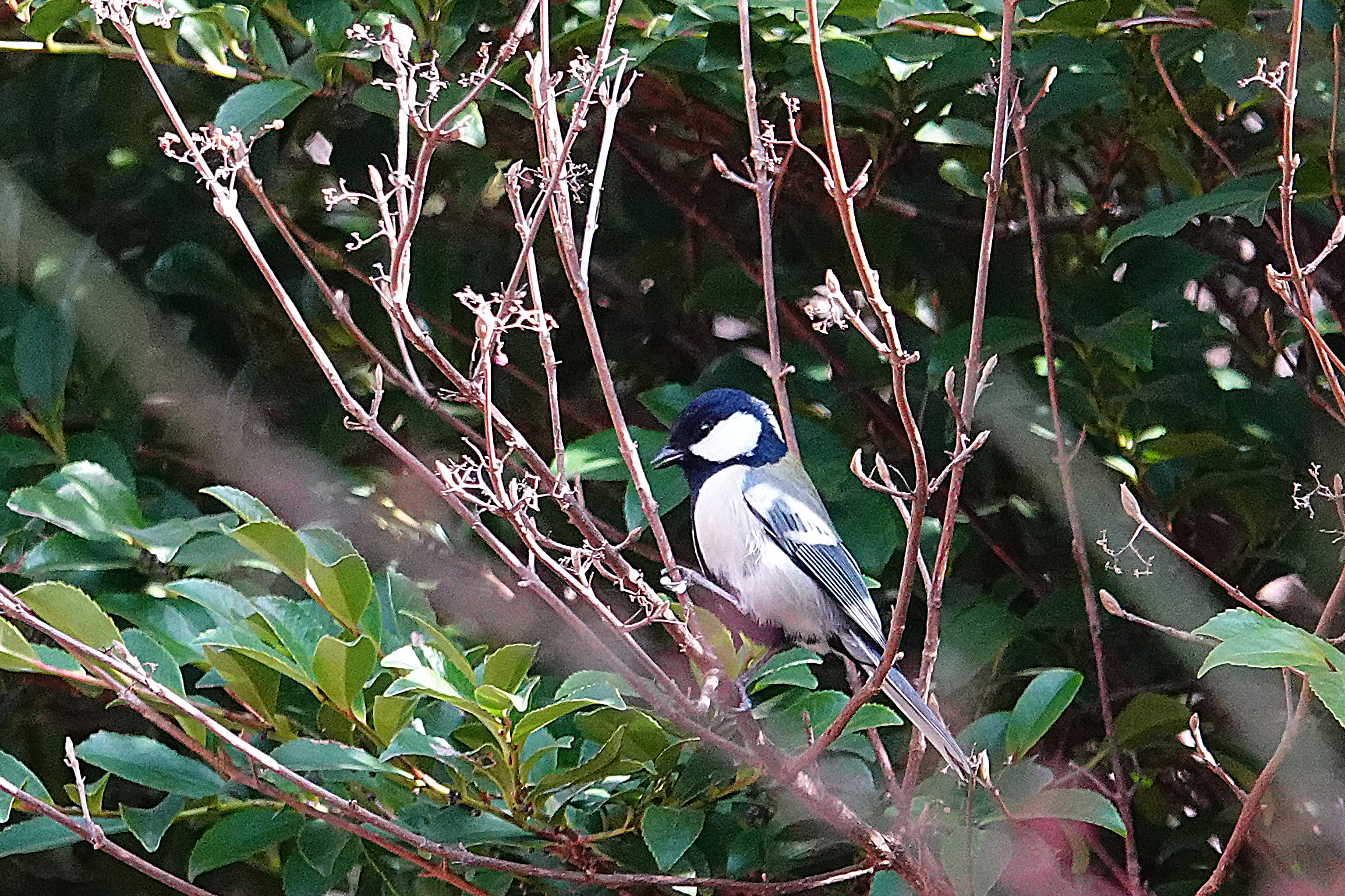 梅園では梅の花に来るメジロはいなかった。そろそろ引き上げようと、バス通りへ上がる道へ行くと、野鳥の姿があった。シジュウカラだ。