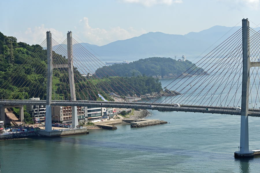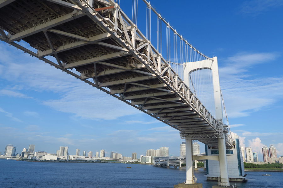 293.横浜ベイブリッジ -2 wikipediaによれば、横浜ベイブリッジは、1989年(平成元年)9月27日に開通した長さ860 m(中央支間長460 m)の斜張橋である。横浜港の本牧埠頭(横浜市中区)と対岸の大黒埠頭(横浜市鶴見区)を結んで架かっており、また横浜港と東京港方面を結ぶ港湾物流ルートの一端を担うことにより、都市部の渋滞を緩和する重要な輸送路である。