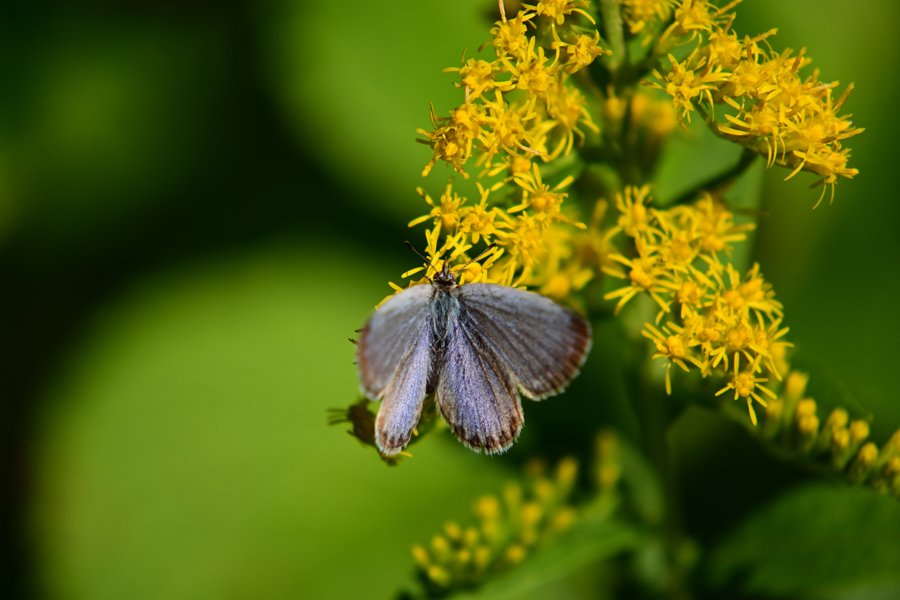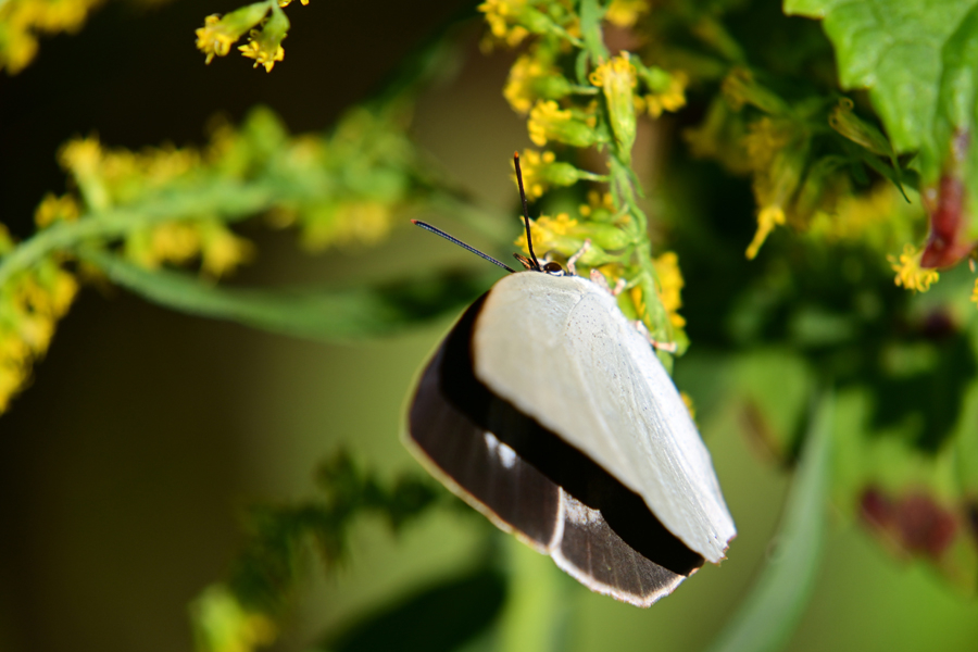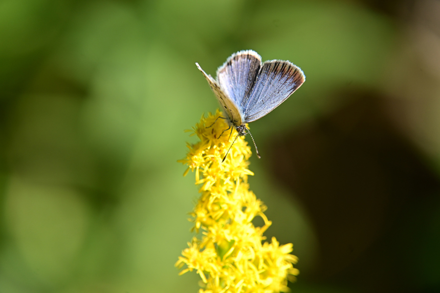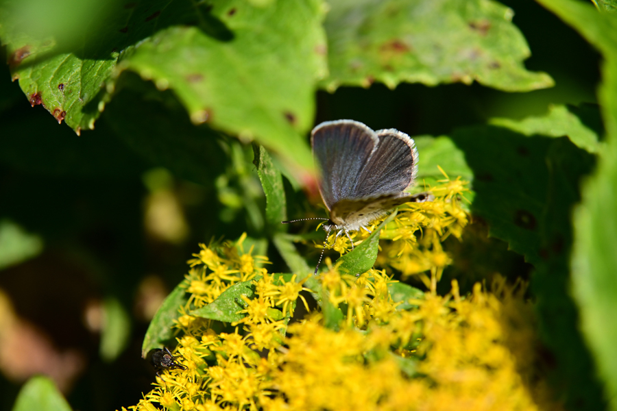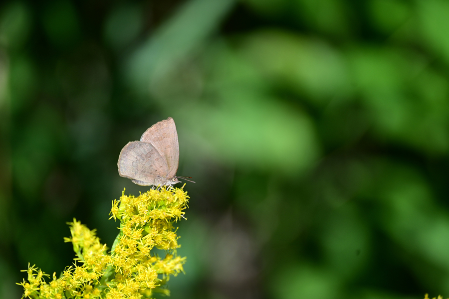 先ほど、ウラギンシジミがどこかへ飛んで行ってしまってから、20分ほど経った後、さっきと同じところへ戻ってみた。いた! セイタカアワダチソウに止まっていた。だが、吸蜜しているようには見えない。