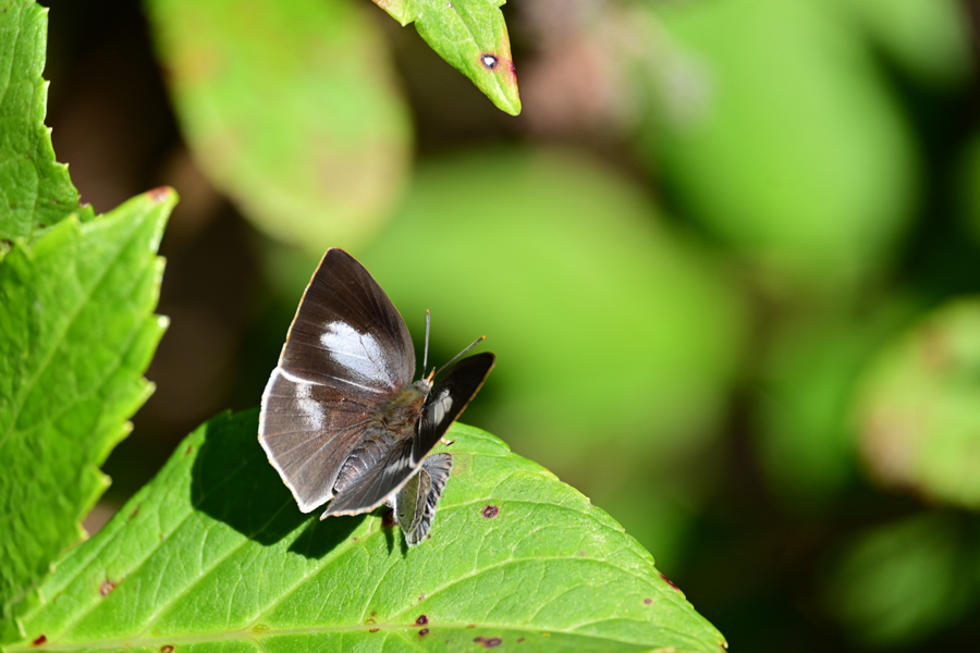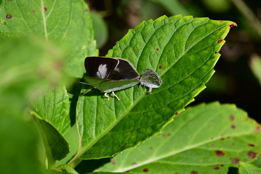 キラッと光ってチョウがとまった。ウラギンシジミの♀だ。頭を葉っぱの影に入れてしまって撮り難い。
