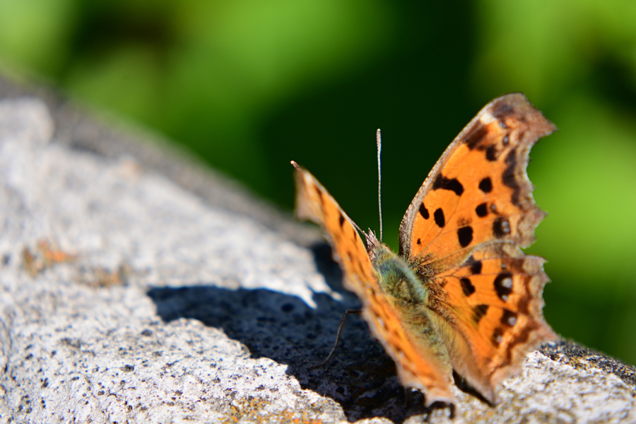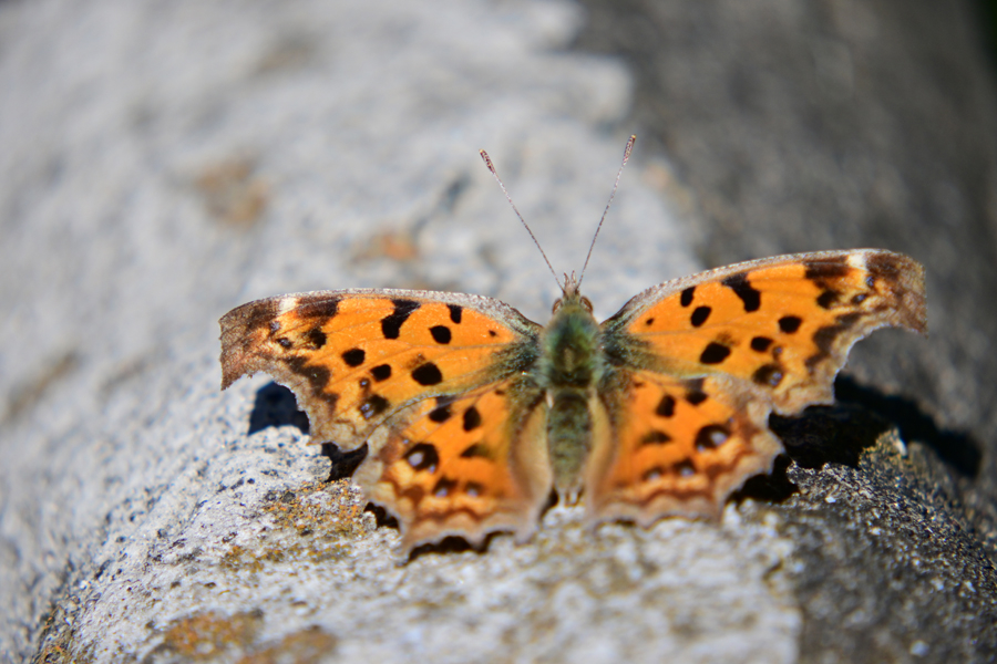 赤銅色のキタテハ秋型が飛んできて、お日様で暖められた道端にとまった。シータテハかと思うほど、翅がくびれている。精悍な感じがする。