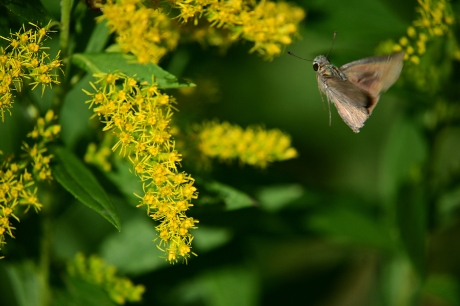 偶然にもチャバネセセリのこんなシーンが撮れた。ピントが合っているセイタカアワダチソウから離脱するところだ。
