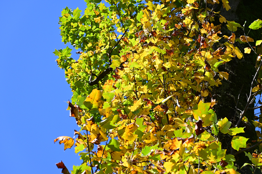 辻広場の下池側の広場に立つ大きなユリノキは見事に紅葉していた。wikipediaによれば、モクレン科ユリノキ属に属する落葉高木の1種で、高さ45mに達することもある大きな木であり、特徴的な形の葉をもつと解説されていた。