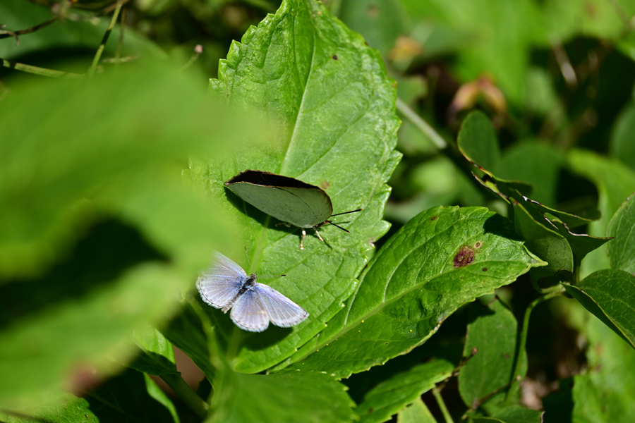 ウラギンシジミは飛び立った。逃げられたかと持ったがすぐ近くの葉の上に止まった。そこへヤマトシジミの♂が飛んできて寄り添うようにならんだ。