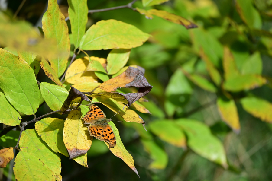 帰路、この日2頭目のキタテハを見た。キタテハの赤銅色の秋型を見ると秋の深まりを感じる。この蝶はもうしばらくすると冬眠に入り、来年の春、暖かい日があれば2月にも飛び始める。