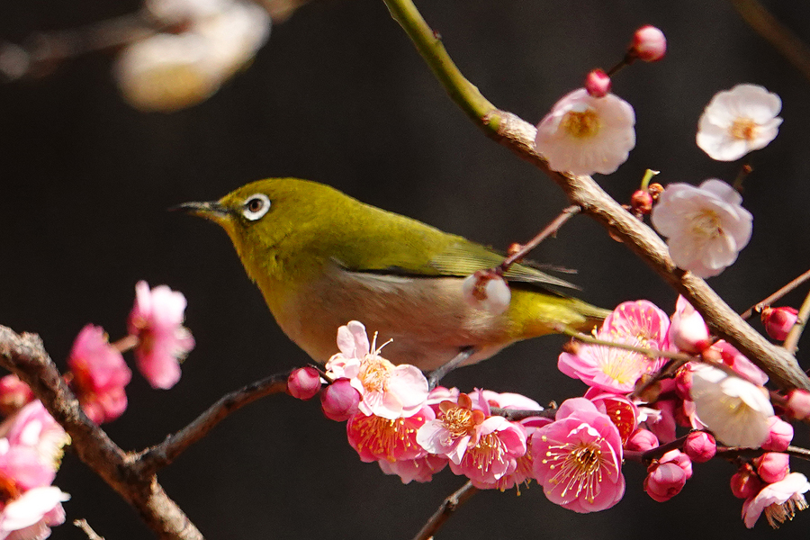 別の個体もやってくるようになった。メジロは桜や梅の花の蜜を好む。その嘴は花の芯に突っ込むのに適したように長く鋭い。