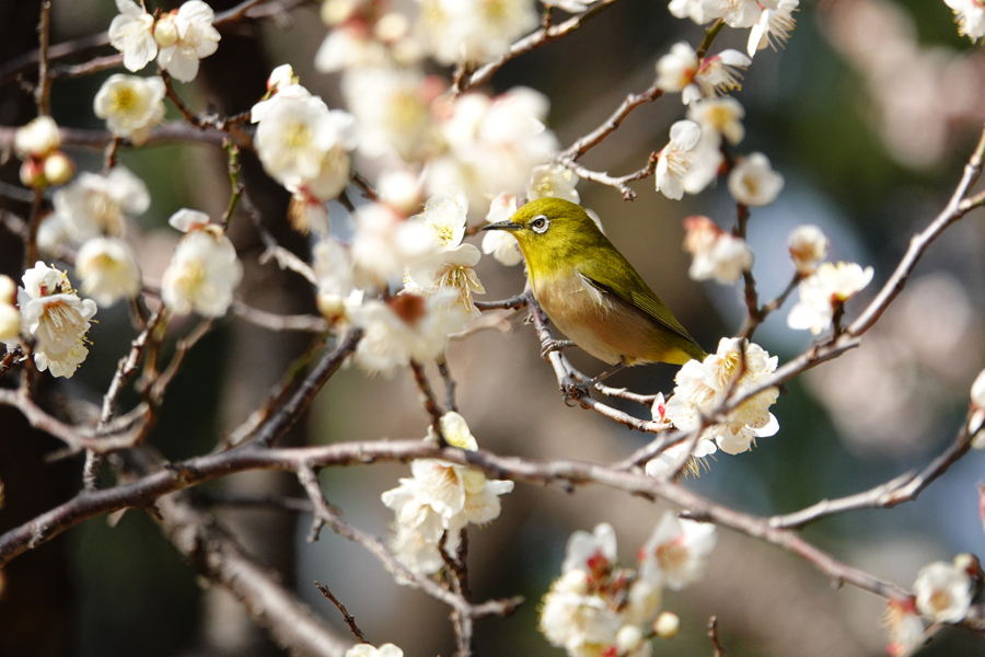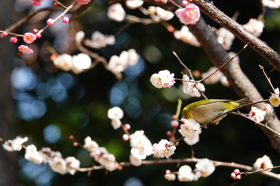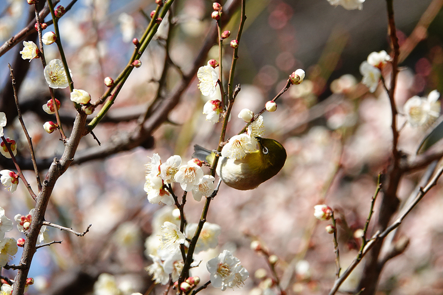 11時を過ぎた。梅園の東の方へ移動すると、さっそくメジロが「思いのまま」の花から花へ飛び回る姿が目に入った。