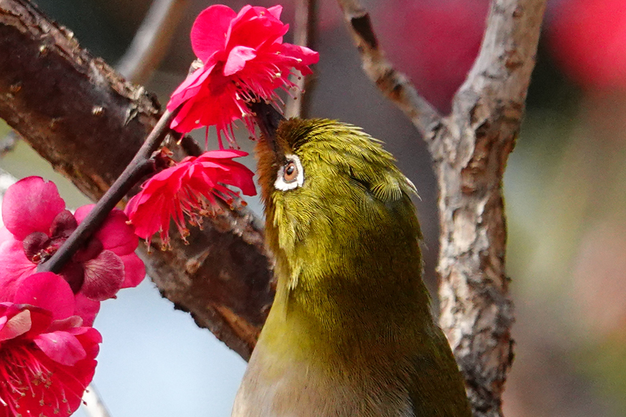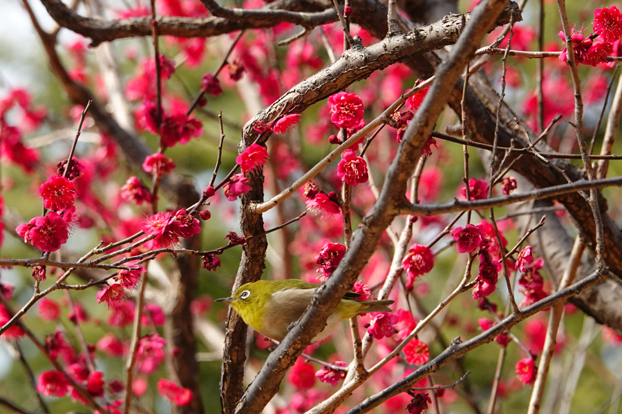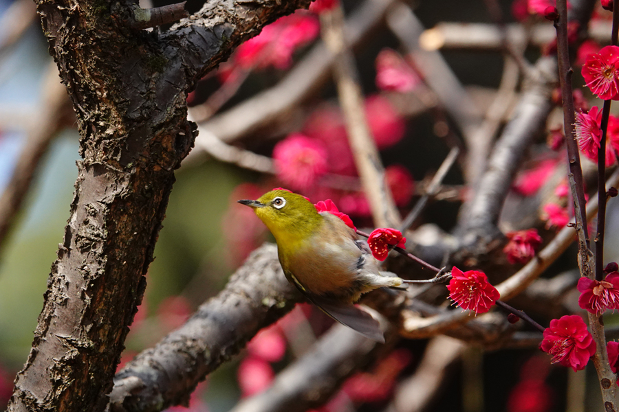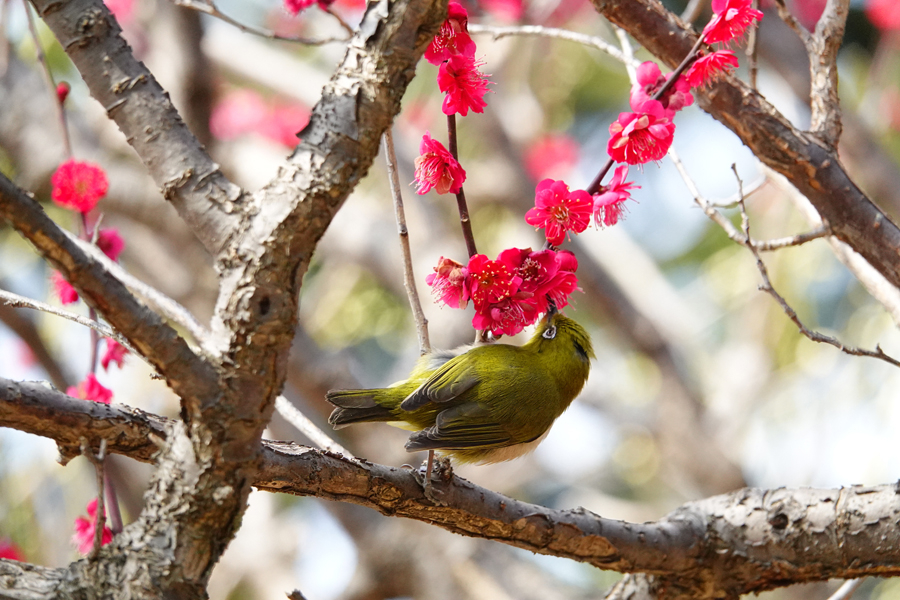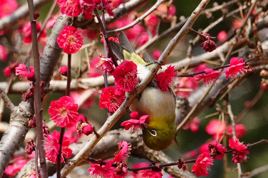 いつもは、早咲きで香りの強い「八重野梅」にメジロが多く、その写真を撮ることが多いが、この日は、「八重野梅」に加え、「八重寒紅」、「思いのほか」そして今まで見たことのない「鹿児島紅」で吸蜜するメジロを撮影できた。