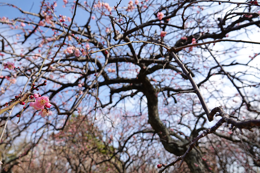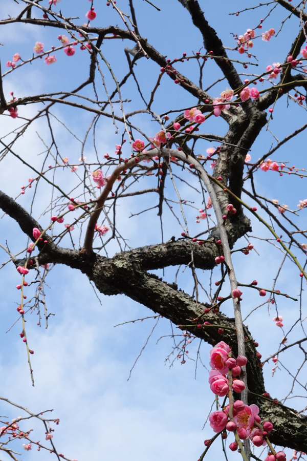 テニスコートの脇を通って梅園に入る。2月5日に来て、咲き始めた2株の枝垂れ梅、「玉光枝垂」、「呉服枝垂」を見たが、その時はうまく枝垂れ梅らしく撮ることができなかったので再チャレンジしてみる。まだあまり花は咲き進んでいない。