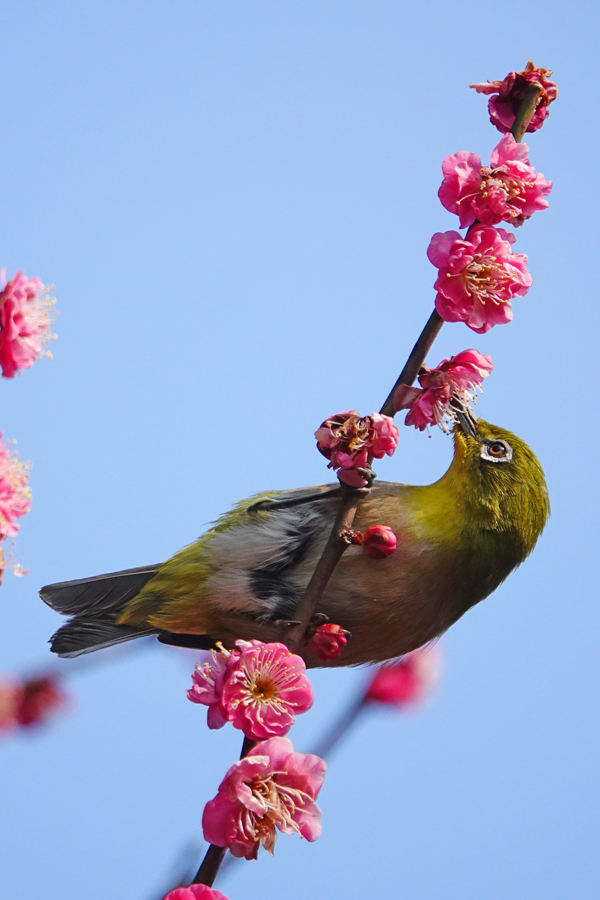 メジロは香りがある「八重野梅」の花に良く集まる。メジロはどんな姿勢でも吸蜜することができるようだ。