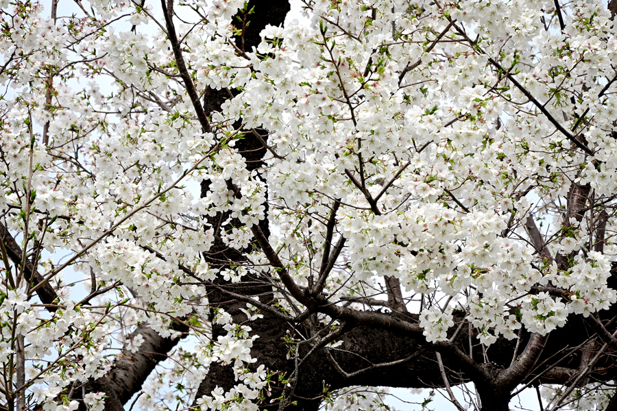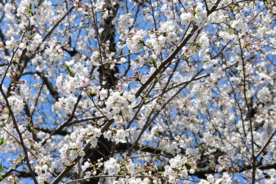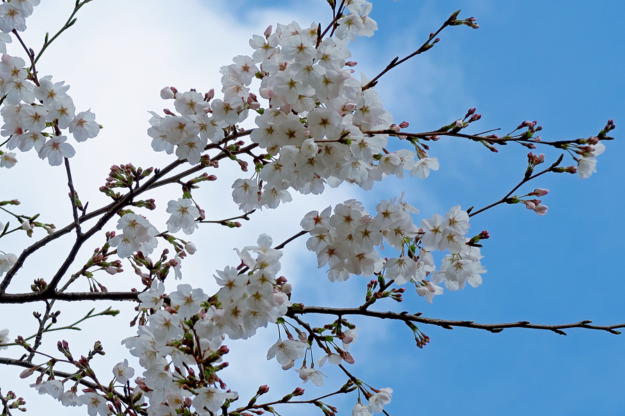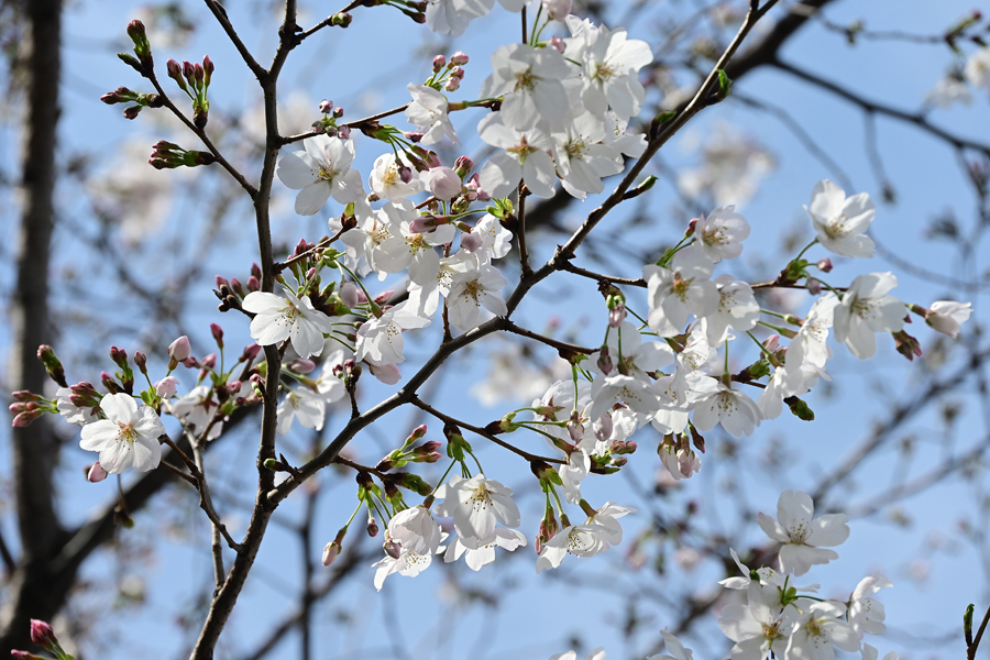 2週間前に見たときは、まだ数輪の花をつけていただけだったが、ほぼ満開で、見事に咲いていた。マメザクラと、エドヒガンの雑種と推定されている。