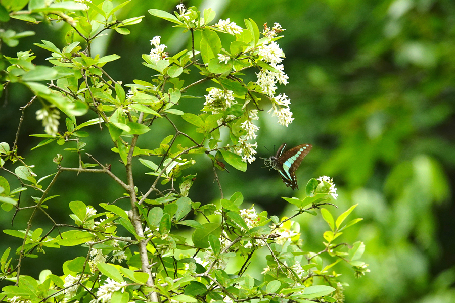 そのツリフネソウにナガサキアゲハが吸蜜に来た。珍しいチャンスだった。何とか良い写真を撮ろうと思い粘ってみたが、手前の葉が邪魔になってしまい良い角度で撮れなかった。残念ながら、だいぶ傷んだ個体であった。