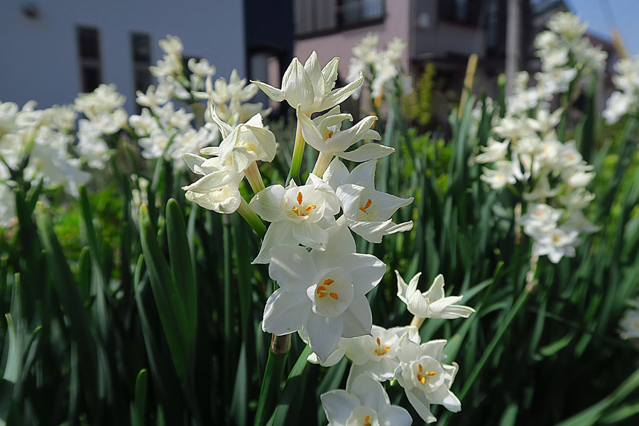 ちょっと変わったスイセンの花が植えられていた。PictureThisで検索すると、シロバナスイセンといい、白い花を咲かせるスイセンの一種だそうだ。ペーパーホワイトとも呼ばれる。平安時代に日本に渡来した多年草で、道端で見かける黄色いニホンズイセンとは違う。葉はニラに似ているが、毒があるため注意が必要だそうだ。