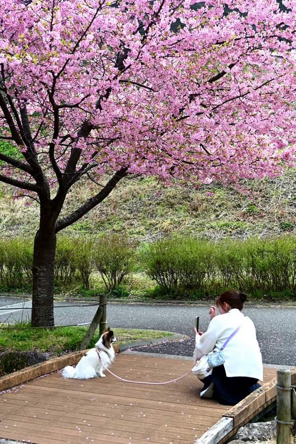 カワズザクラの木の下でせせらぎに架かる木橋に愛犬のパピヨンを座らせ、とっておきの写真を撮ろうとされていた。愛犬もよく言うことを聞いてポーズをとる。